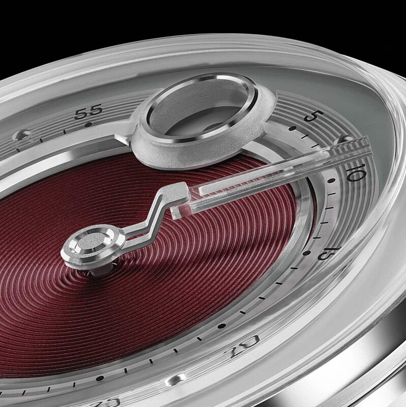 Le concept de la montre s’articule autour d’une harmonisation de couleurs subtile, où le centre rouge du cadran est entouré de nuances neutres, créant ainsi un contraste visuel raffiné. L’intégration de matériaux comme le saphir ajoute une profondeur et une dimension visuelle qui captivent l’observateur.