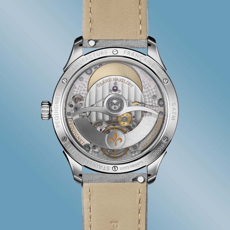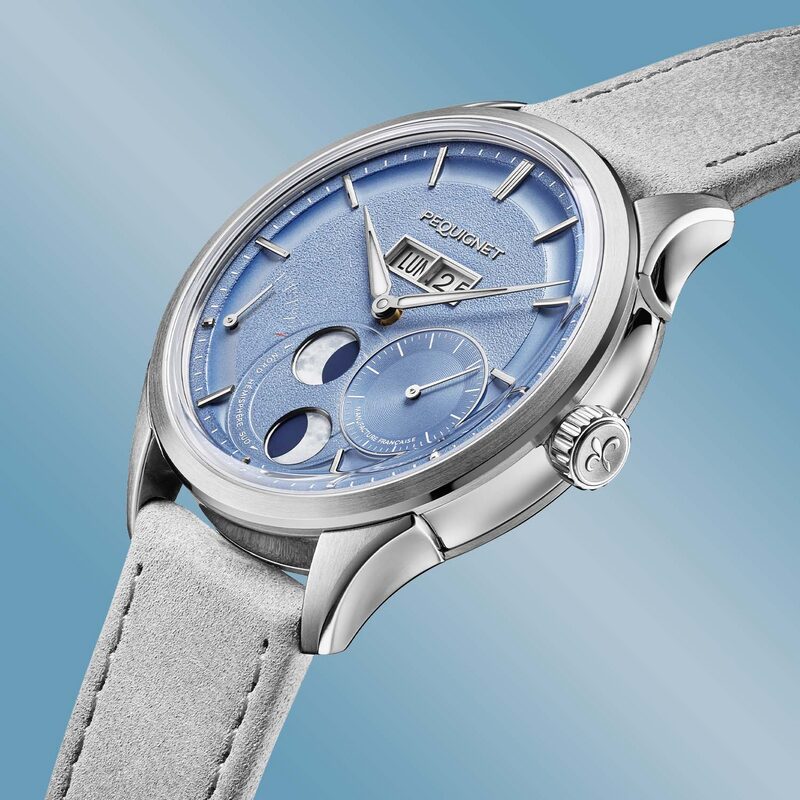 Chaque élément de la Pequignet Royale Paris Icy Blue a été soigneusement pensé pour séduire les amateurs de belles mécaniques. Des lugs prolongés à la couronne ornée d’un motif fleur-de-lys, chaque détail exhale l’élégance.