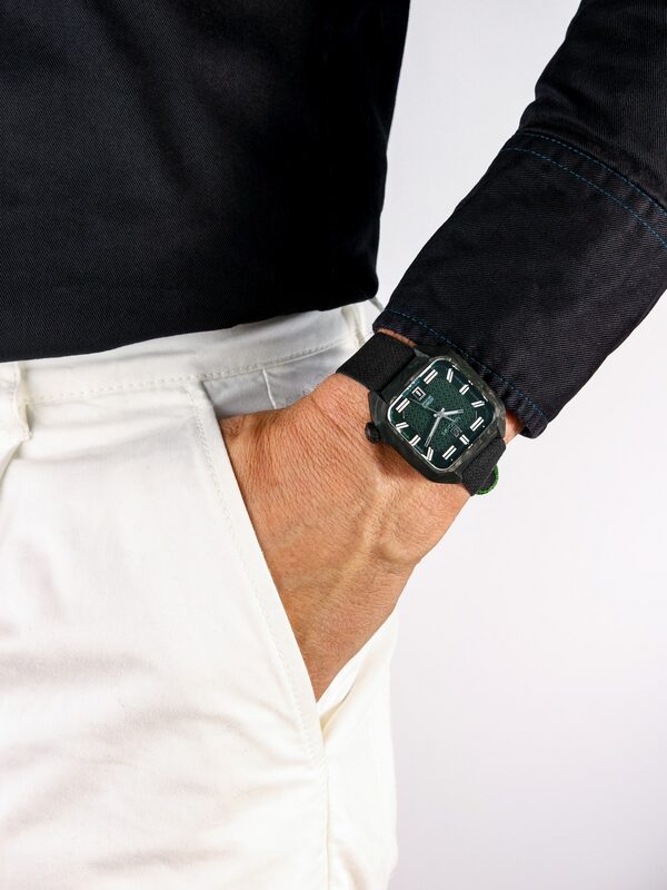 Visuellement, le boîtier se distingue par une texture unique, résultant de la combinaison de fibres noires et de résine verte. Cette palette crée un contraste intrigant, offrant au regard une touche de mystère et d’élégance. Les reflets changeants sous différentes conditions de lumière ajoutent une dynamique supplémentaire, faisant de chaque regard une nouvelle découverte.