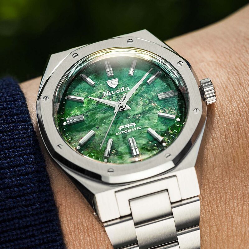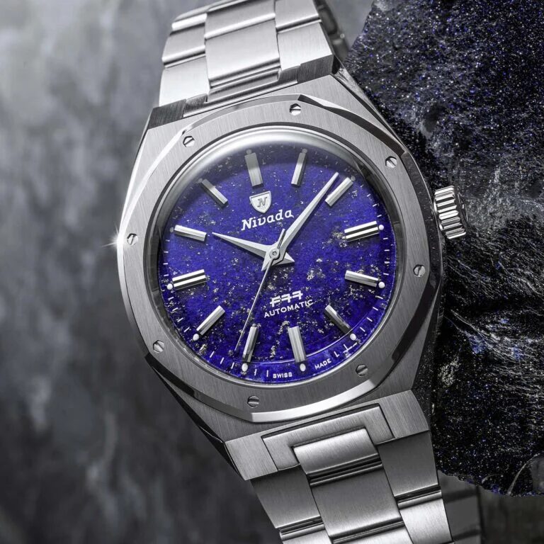 Les *cadrans en pierre* de la Nivada Grenchen F77 MKII apportent une touche unique et raffinée à ce garde-temps. Disponibles en lapis-lazuli, météorite, aventurine verte et bleue, chaque cadran est une pièce d’art naturel, garantissant une montre véritablement unique grâce aux variations inhérentes à chaque pierre.