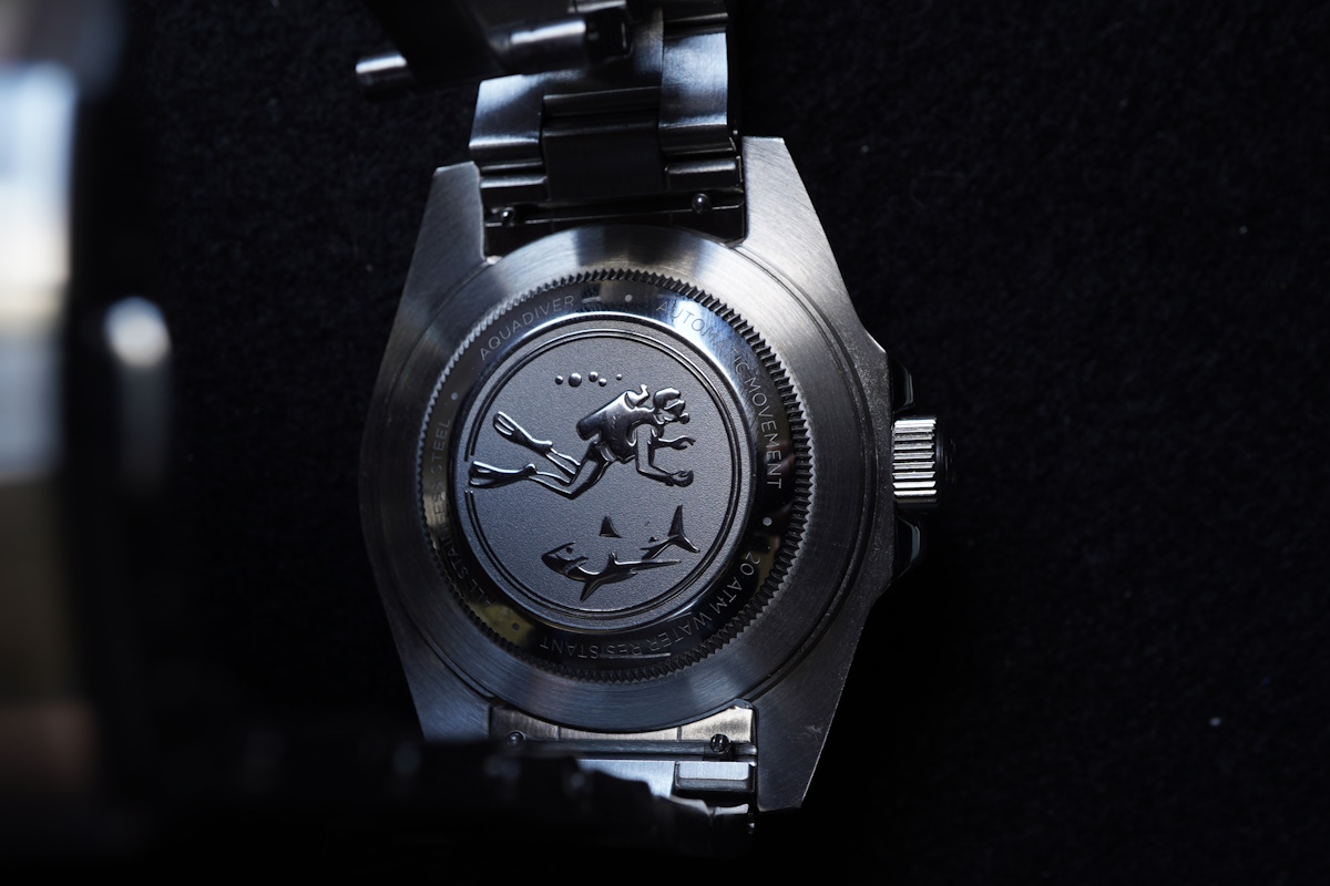 Enfin son fond vissé garantit une étanchéité à 200 mètres, idéale pour les amateurs de plongée ou ceux qui recherchent une montre fiable au quotidien. La gravure d’un plongeur décore le centre du fond de boite tandis que sur la périphérie on lira les inscriptions « automatic movement », « 20 atm water resistant », « stainless steel » et « Aquadiver ».
