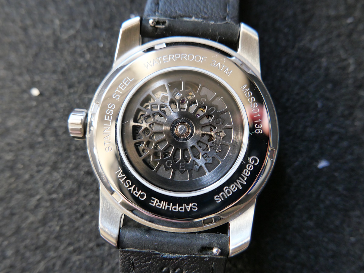 Enfin un fond de boite transparent assure une étanchéité limitée à 30 mètres. Il permet d’apprécier les décorations du calibre automatique. Sur sa périphérie on lira les inscriptions « Waterproof 3ATM », « Stainless Steel », « Sapphire Crystal » et « GearMagus ».