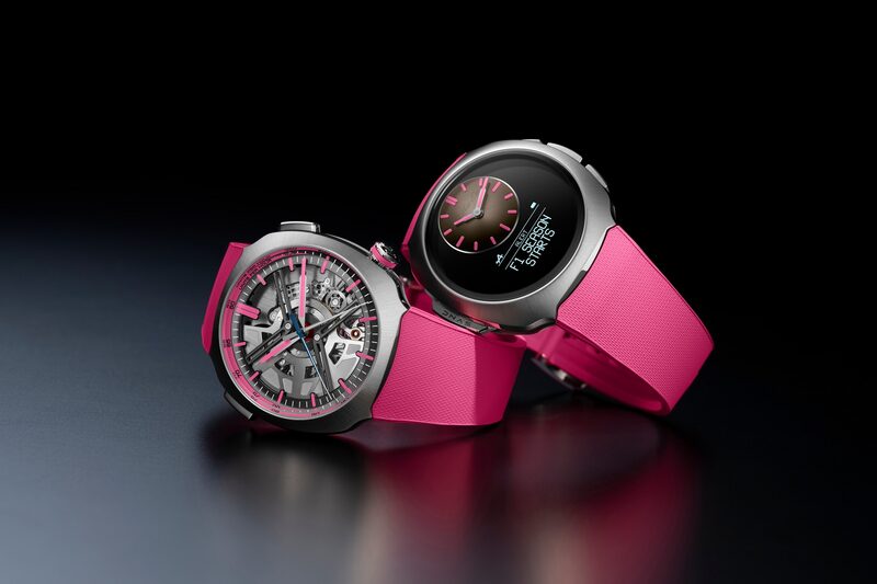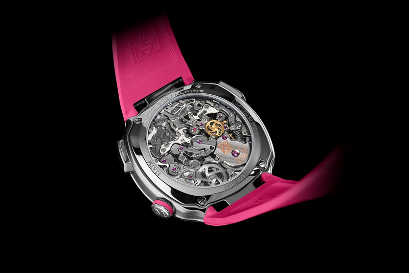 Le bracelet en caoutchouc rose, complémentant les accents du boîtier et du cadran, ajoute une touche de modernité qui n’altère en rien le luxe de l’ensemble. Cette harmonie de style et de couleur est un véritable tour de force pour les créateurs. La montre est dotée de fonctionnalités avant-gardistes tout en conservant un affichage clair et lisible grâce à son design épuré, accentué par un disque transparent squelettisé qui révèle la complexité du mécanisme interne.