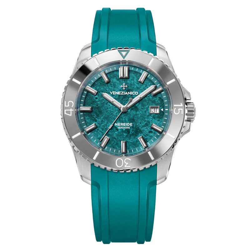 Porter cette montre, c’est célébrer l’héritage sous-marin de Venise, une ville qui a toujours vécu en symbiose avec les eaux qui l’entourent. Le cadre en acier inoxydable de la *Nereide Verdigris* rappelle la solidité et la constance des traditions véhiculées par la Sérénissime, tandis que son bracelet en caoutchouc ajoute une touche contemporaine, parfaite fusion entre héritage et modernité.