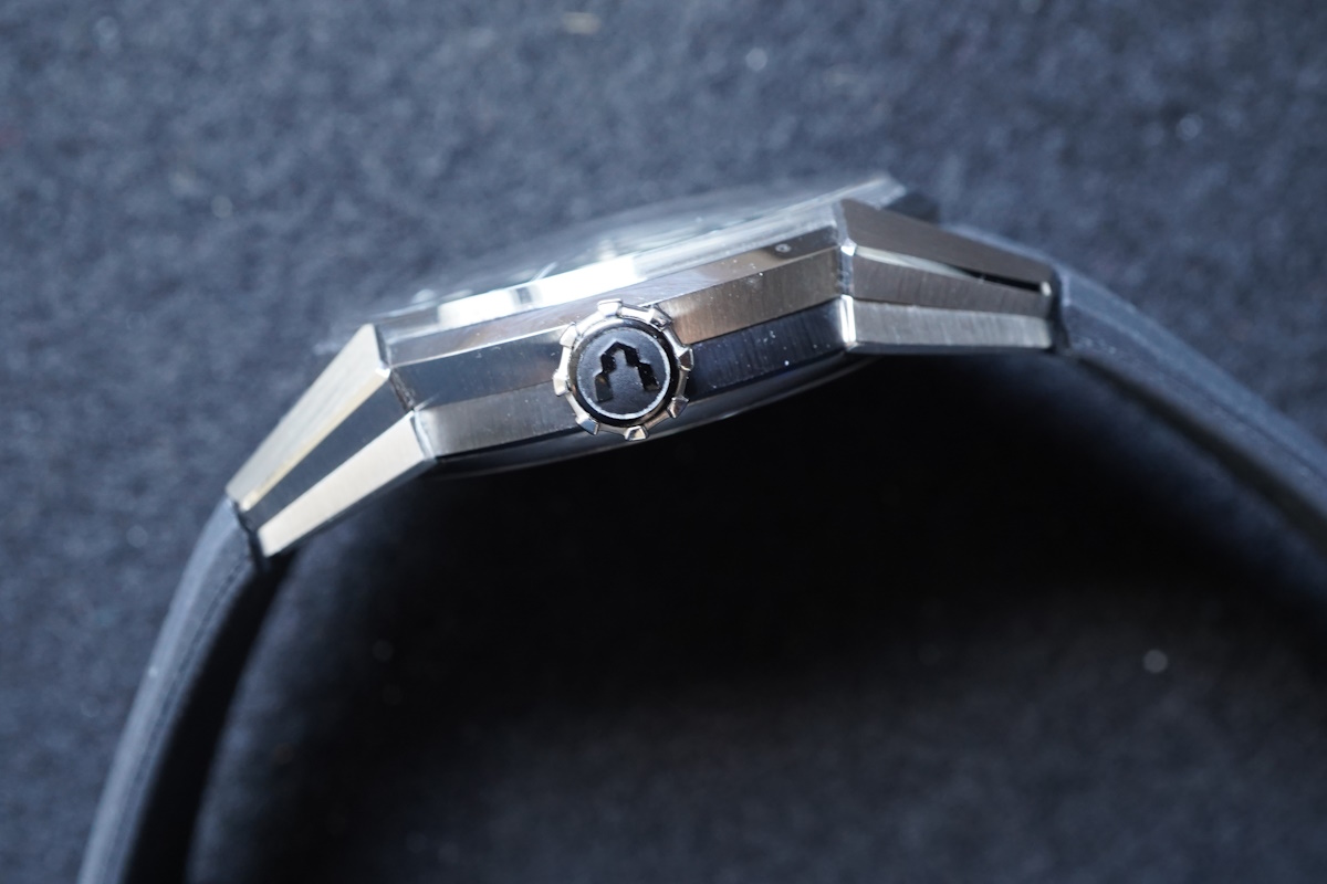 Pour continuer une couronne logotée, positionnée à 3 heures, adopte une forme polyédrique originale, en harmonie avec l’esprit géométrique de la montre. Ses facettes assurent une excellente prise en main, tout en ajoutant une touche graphique à l’ensemble.