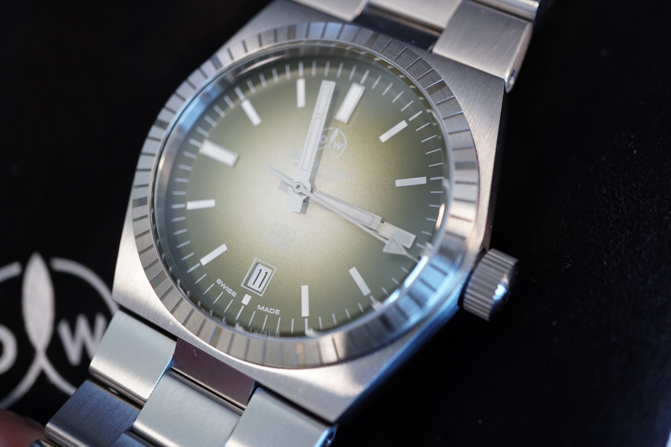 Avec son fond « Tundra Green Fumé », obtenu par un double laquage, le cadran de l’Ollech & Wajs 8001 Tundra offre un dégradé organique, évoquant les nuances changeantes des paysages nordiques. La couleur passe d’un vert clair au centre à un noir intense sur le pourtour, créant un effet de profondeur et de dimension.