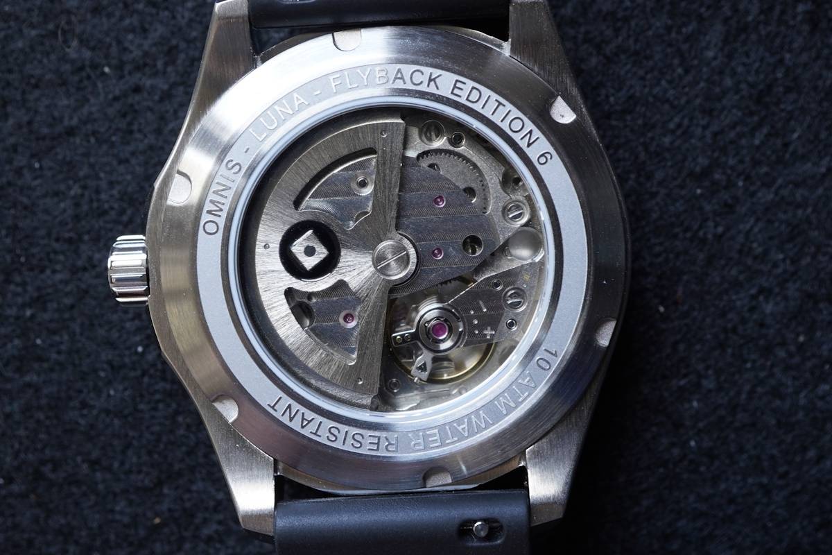 Enfin un fond de boite transparent laisse entrevoir le calibre japonais Miyota série 8 dont la masse oscillante est décorée. Sur sa périphérie on lira les inscriptions « 10 ATM Water Resistant », « Omnis Luna Flyback édition » et le numéro unique de la montre sur 100 exemplaires.