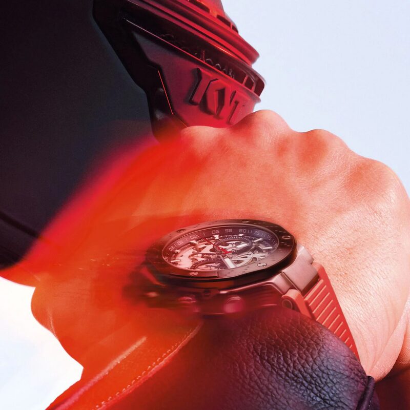 Chaque penchement de la montre offre un aperçu de son fonctionnement interne, tandis que le bracelet en caoutchouc rouge renforce son allure sportive. La lunette noire, ornée d’un insert en carbone forgé, symbolise la fusion parfaite entre haute horlogerie et design inspiré des courses.