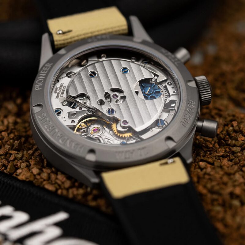 L’utilisation d’un boîtier en titane Grade 5 est l’un des points forts de ce nouveau modèle. Ce matériau, choisi pour sa légèreté et sa résistance à la corrosion, confère à la montre un aspect moderne et technique, sans compromettre la robustesse attendue des montres de pilotes. Le titane a été sandblasté pour obtenir une finition mate et furtive qui renforce l’attrait visuel de la montre.