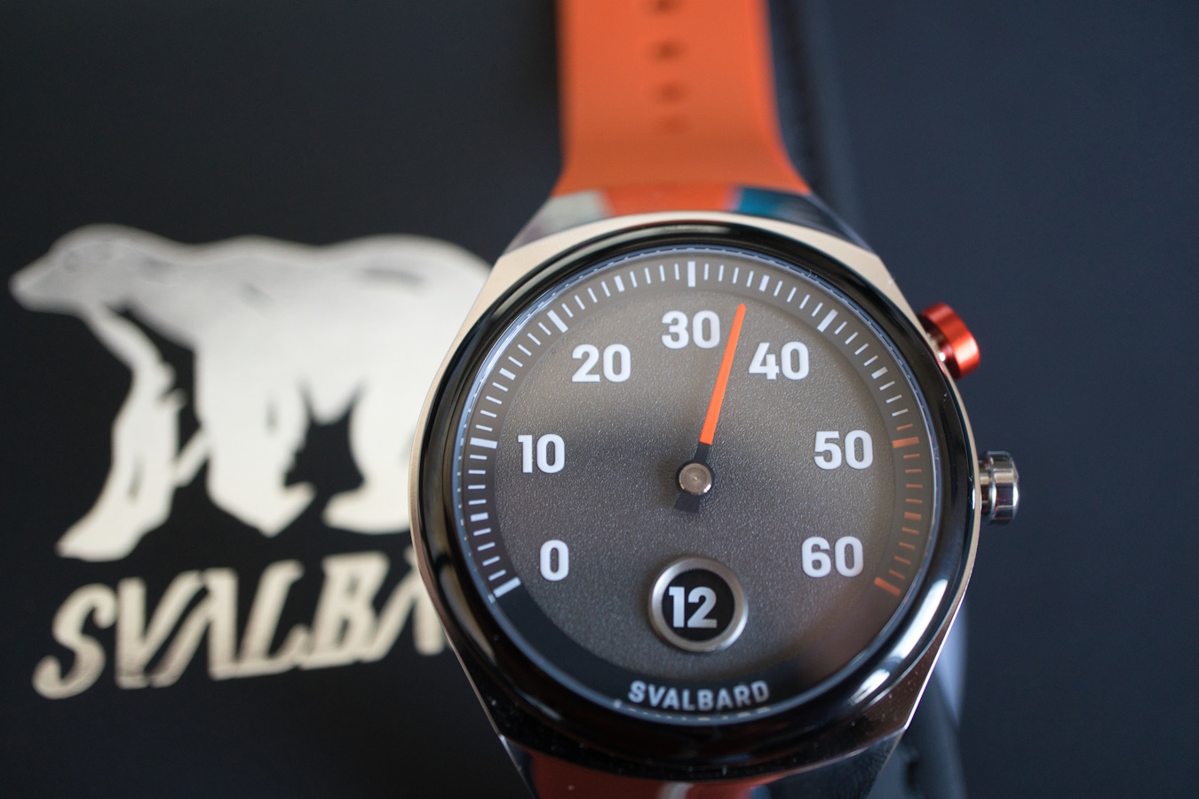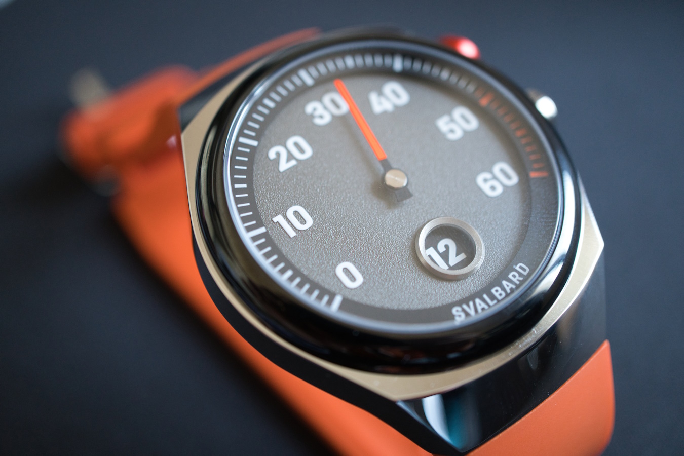 Une seule aiguille orange vif indique les minutes sur un chemin rétrograde semi-circulaire, débordant de modernité. Ce choix renforce la lisibilité tout en ajoutant une touche de couleur vive qui casse le monochrome général de la montre. Les heures, quant à elles, sont affichées via un guichet arrondi situé à 6 heures, une complication qui reflète le souci de simplicité et de technicité de la marque Svalbard.