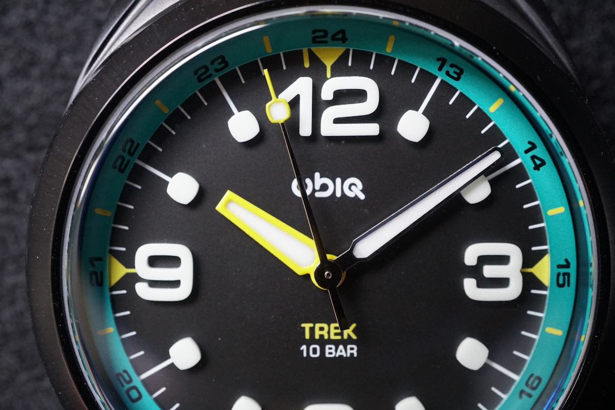 Le cadran de la Ubiq Trek frappe d’emblée par son esthétique moderne et dimensionnelle. Arborant un fond noir mat, il met parfaitement en valeur les éléments graphiques qui le composent, tout en assurant sa lisibilité. Un rehaut turquoise vif, parcouru d’une échelle 24 heures et de repères jaunes, dynamise l’ensemble et apporte une touche de fraîcheur urbaine, signature visuelle forte de la montre.